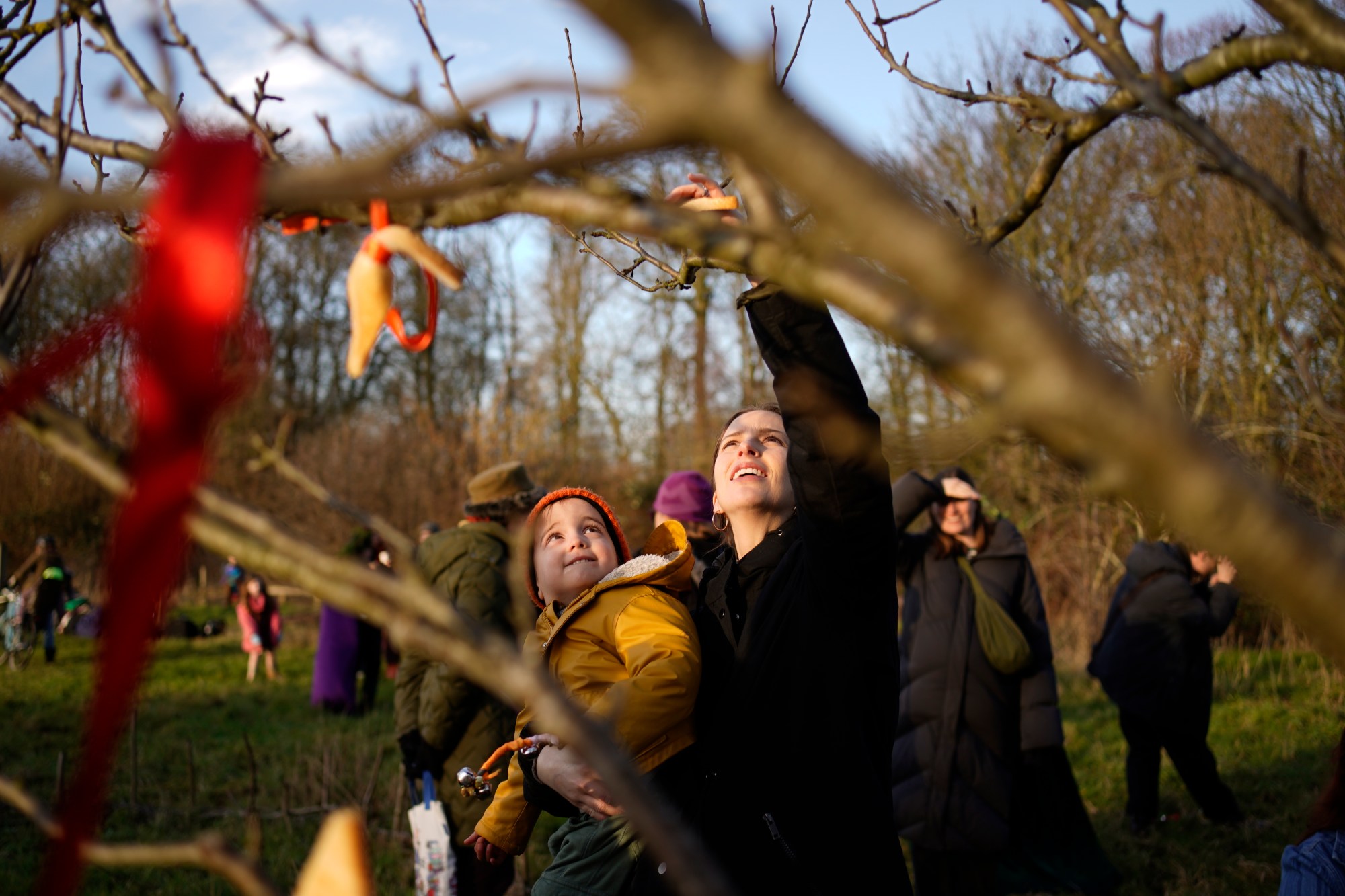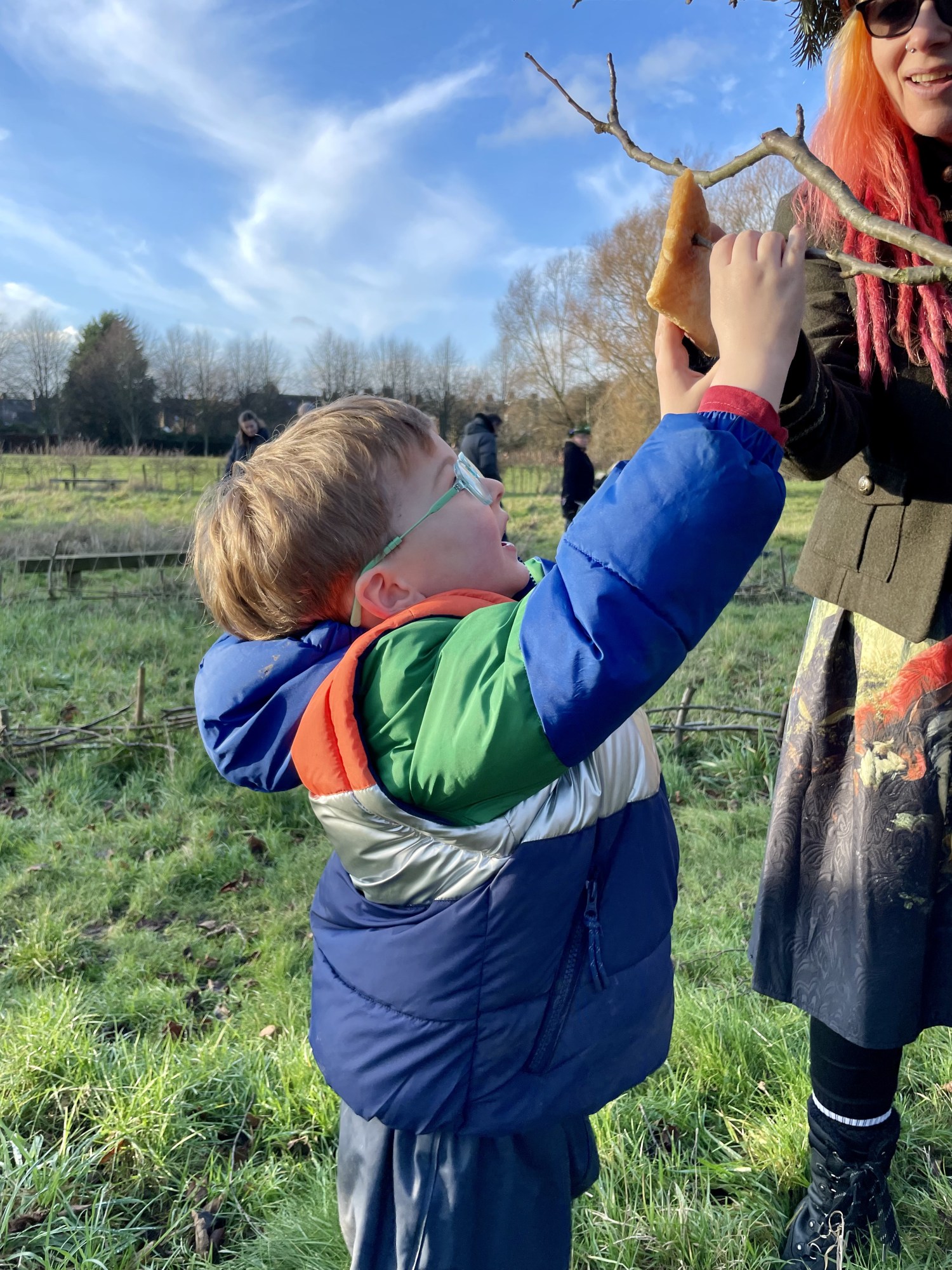 Together, the group processed through the park to the Rowntree Park orchard, home to twelve different apple trees. There, families made plenty of noise to wake the trees from their winter rest, dipped bread into warm wassail juice and hung it on branches as offerings to thank the ‘spirit of the tree’, traditionally symbolised by robins. Ribbons were tied to branches and wishes were made for the year ahead, before everyone shared a warming cup of wassail juice together.